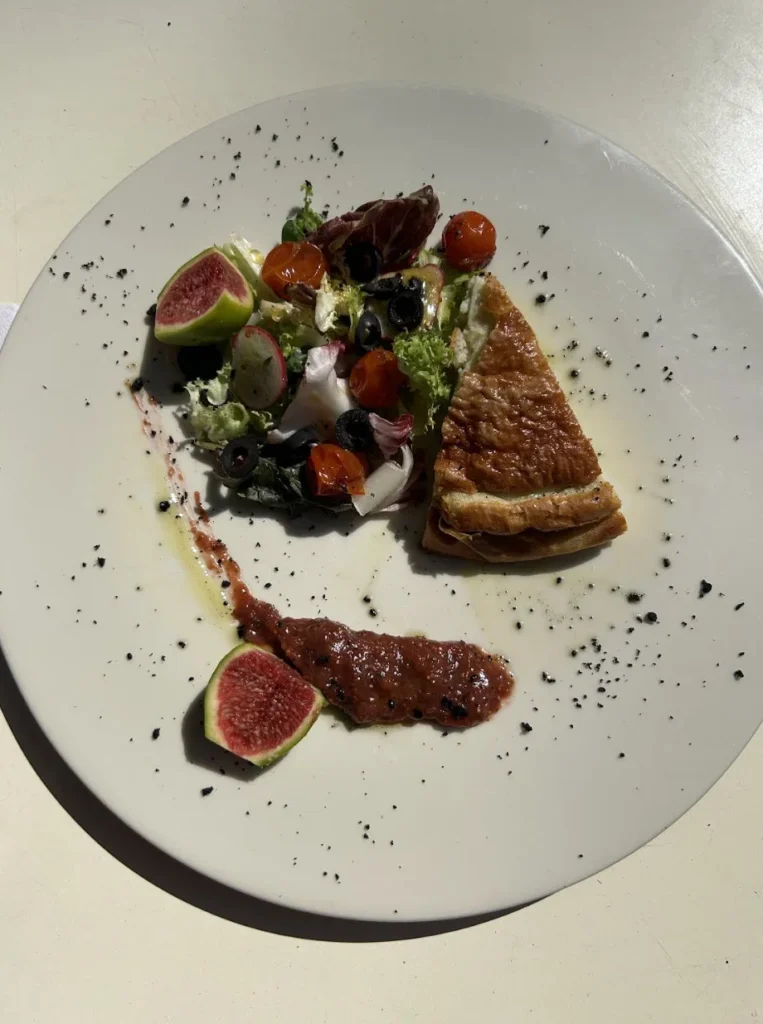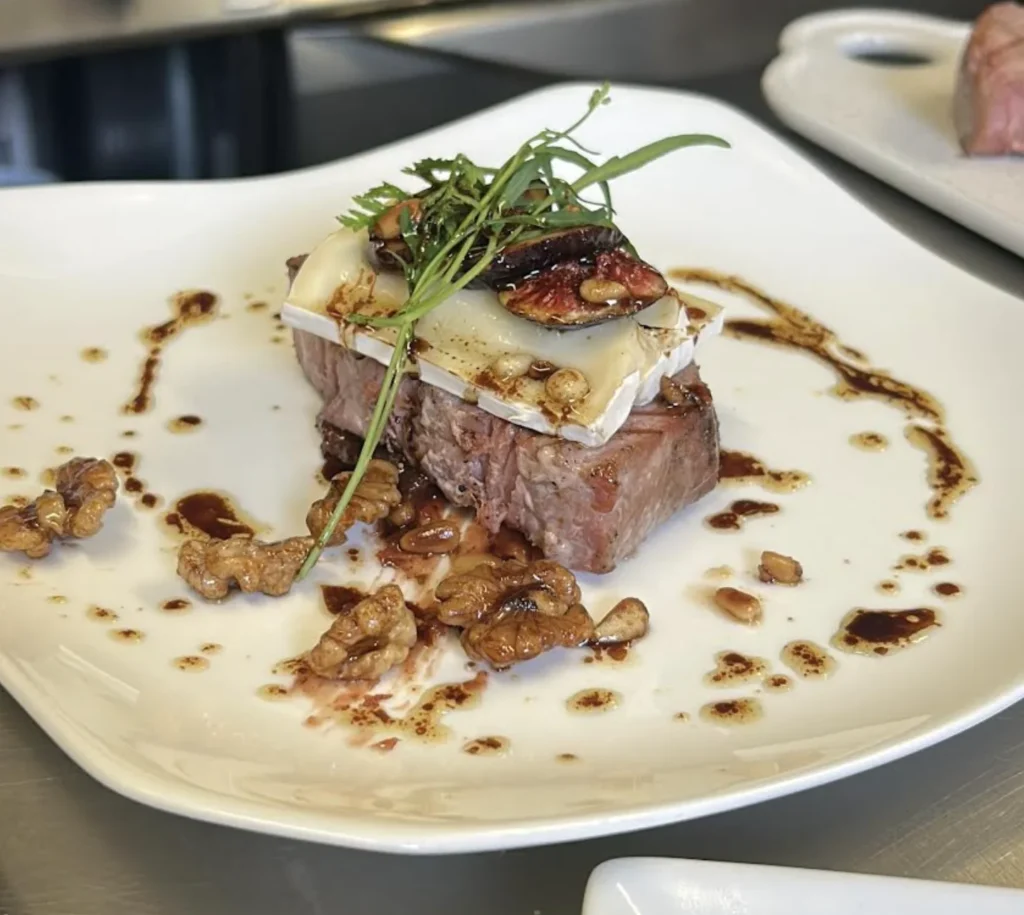 Filet de tonyina marcada a la planxa amb formatge fos, figues a la planxa, nous i pinyons.