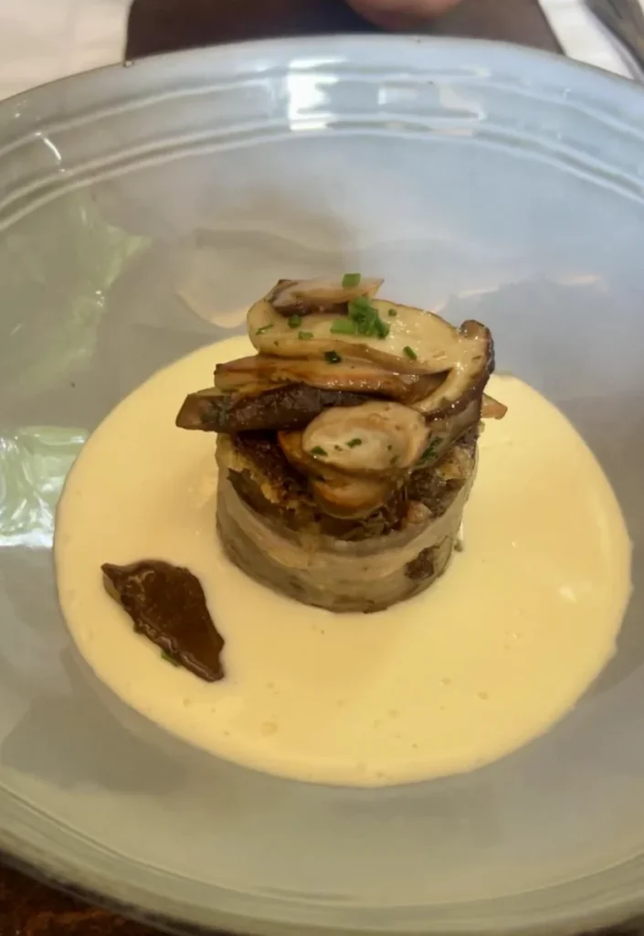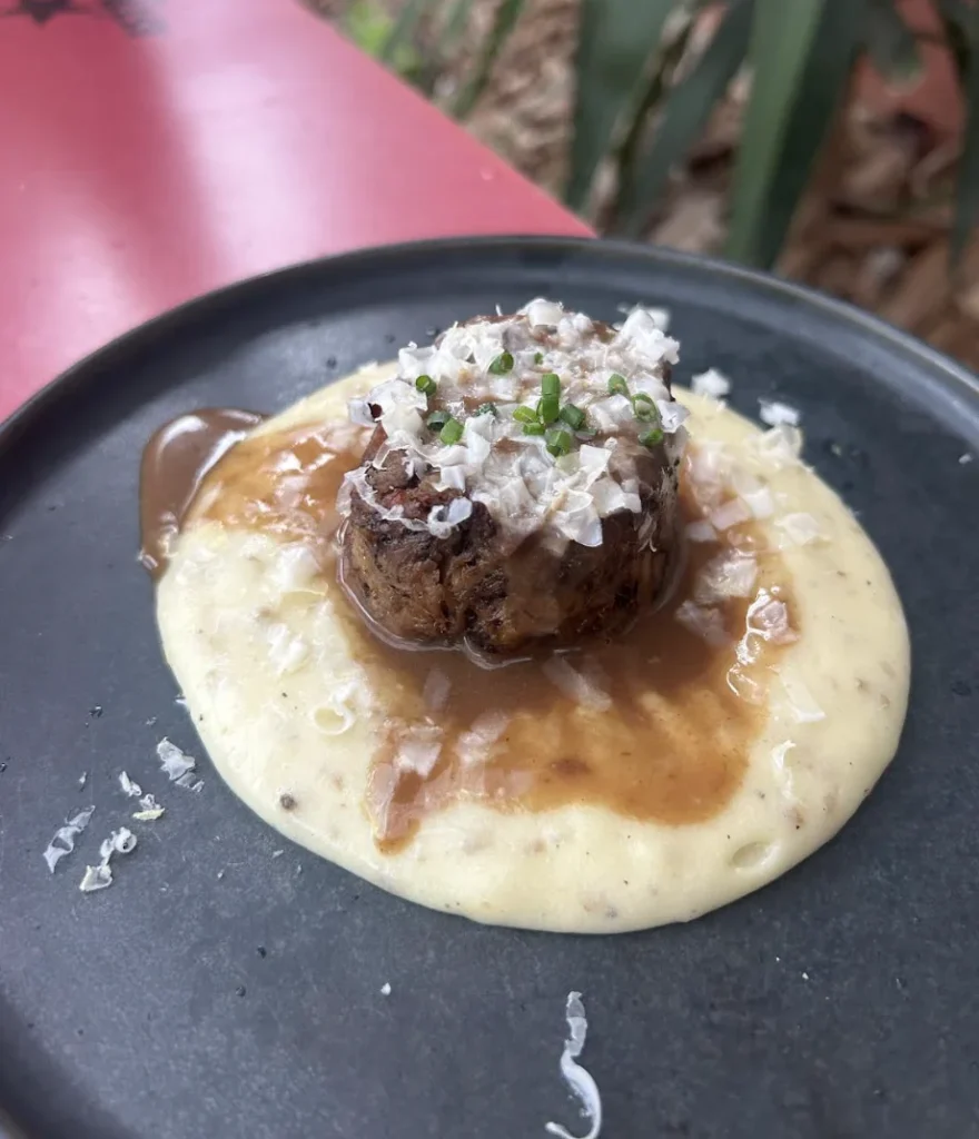Turnedó de cua de bou amb panxeta al voltant amb parmentier de formatge.